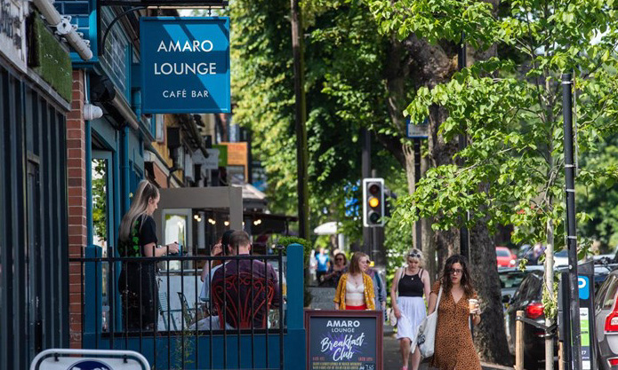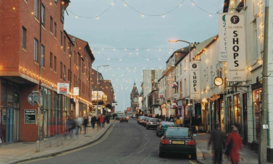 Bustling street spanning out from the city square with independent shops, cafés and restaurants.